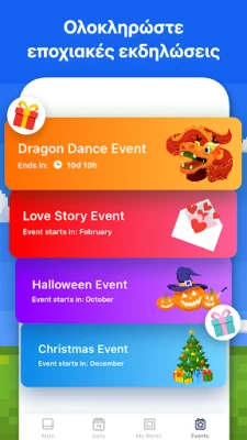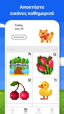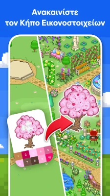 Κάθε μέρα φέρνει νέες ευκαιρίες για καλλιτεχνική έκφραση, καθώς προστίθενται συνεχώς φρέσκα σχέδια για να χρωματίσετε. Ανακαλύψτε επίσης τον μαγευτικό Κήπο Ανθών, ένα ολοκαίνουργιο χαρακτηριστικό όπου μπορείτε να δημιουργήσετε τον δικό σας παράδεισο, χρωματίζοντας μοναδικά αντικείμενα και κερδίζοντας αποκλειστικές ανταμοιβές. Συμμετέχετε σε συναρπαστικές Εποχιακές Εκδηλώσεις με θεματικές εικόνες για γιορτές όπως τα Χριστούγεννα και το Χάλογουιν, εμπλουτίζοντας τη συλλογή σας με μοναδικά έργα. Επιπλέον, μετατρέψτε τις αγαπημένες σας φωτογραφίες σε pixel art αριστουργήματα χρησιμοποιώντας την καινοτόμο κάμερα του Pixel Art, χαρίζοντας τους μια νέα, ψηφιακή ζωή.